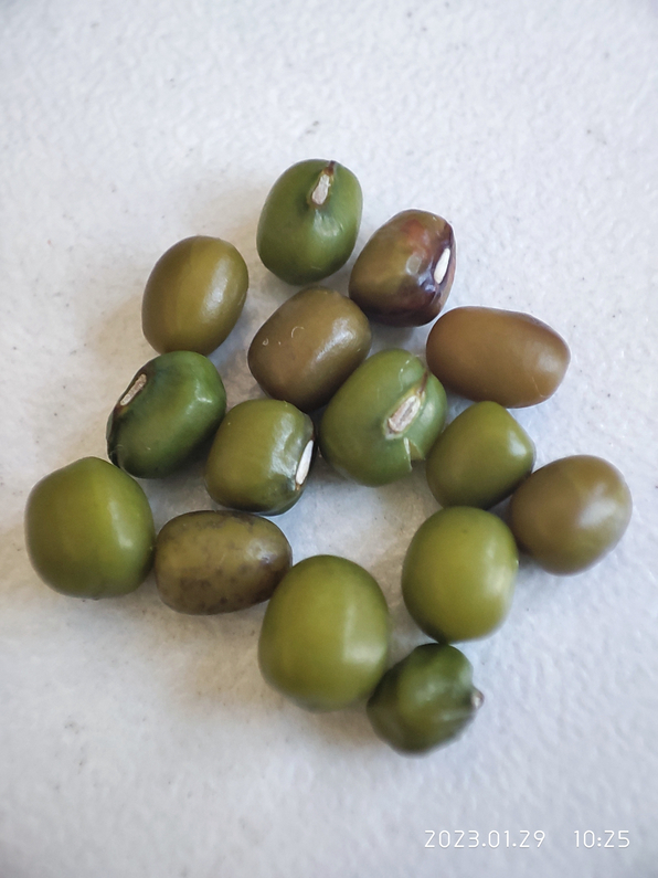 小树种的绿豆扛过低温成熟了一个豆荚。两代绿豆合影。