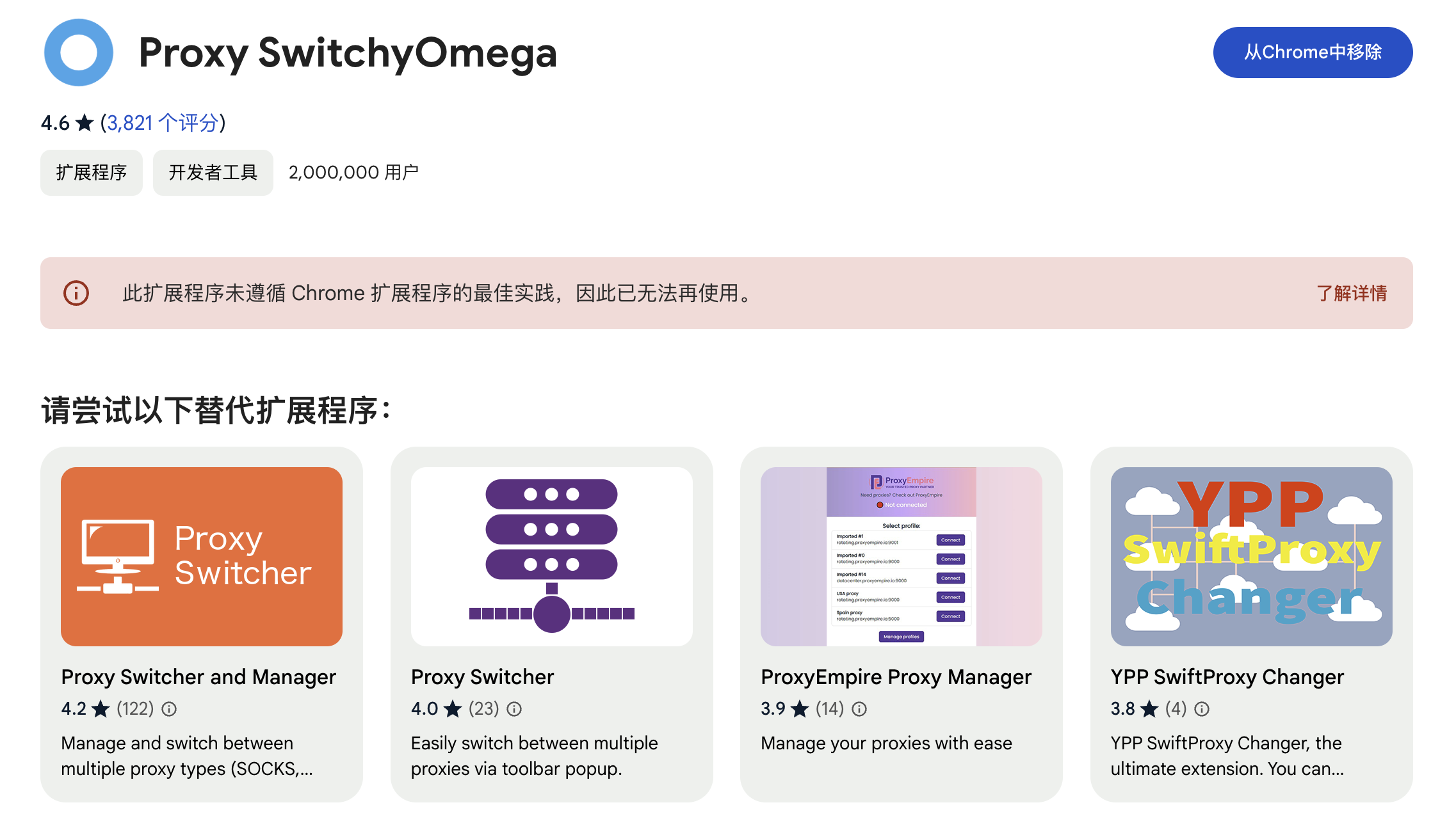 刚刚打开chrome,显示一堆的扩展被Google禁用,一眼看到了Proxy SwitchyOmega这个最频繁使用的扩展也在被删之列。进到chrome扩展商店,显示「此扩展程序未遵循 Chrome 扩展程序的最佳实践,因此已无法再使用。」从菜单里选择了保留,用着习惯了继续用着,后面要找替代扩展了。