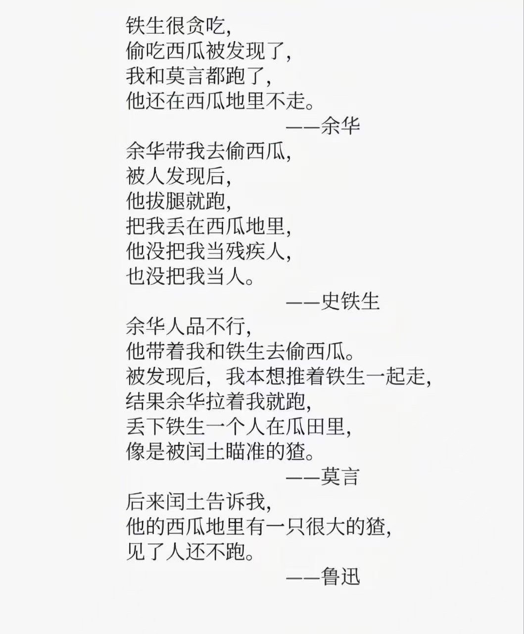 余华人品不行,他带着我和铁生去偷西瓜。被发现后,我本想推着铁生一起走,结果余华拉着我就跑,丢下铁生一个人在瓜田里,像是被闰土瞄准的猹。—— 莫言